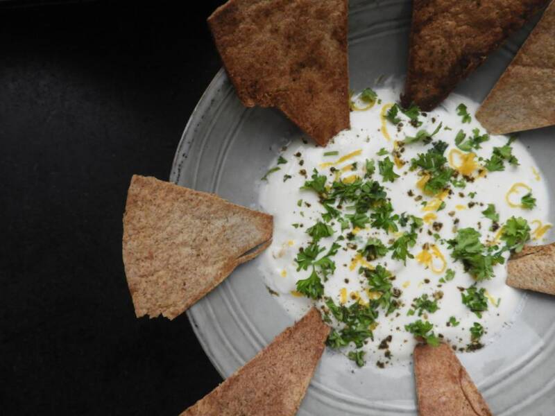 Wil jij het gerecht afmaken? Serveer er dan tortillachips bij. Ik maakte deze van volkoren wraps, roosterde ze 5-7 minuten in een ovenschaal gemengd met olie, za’ater kruiden en zout. Heeeerlijke combi met de feta dip!!